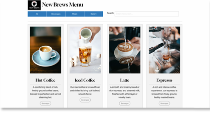 I built a revised menu for my ficticious coffee shop chain, "New Brews," that allows users to search through the menu items and filter them by category (ie. beverages, meals, bakery). All data representing each of the individual menu items is stored in JSON format and is parsed for output by the Vue.js 3 application. The front-end interface was created using the Foundation 6 CSS framework.