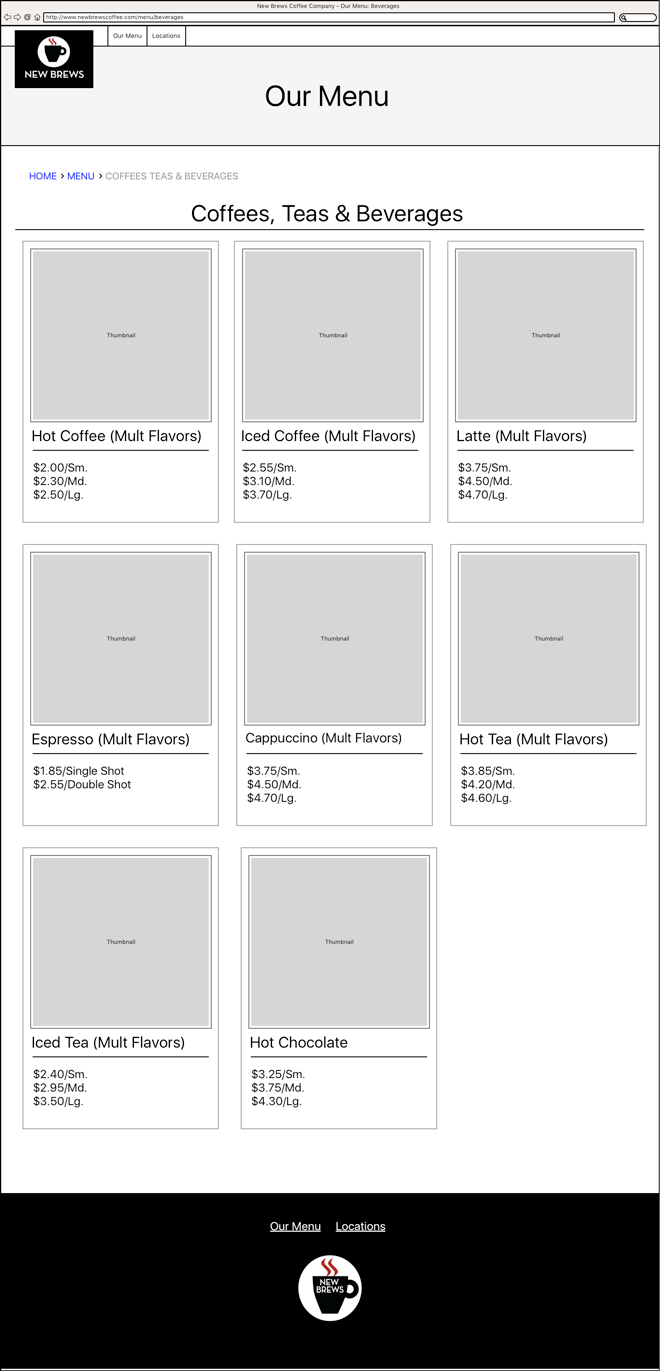 Before developing my WordPress-based website for "New Brews," I developed a series of low-fidelity wireframes for each page of the website in WireframeSketcher using the built-in component library for the Foundation CSS framework.